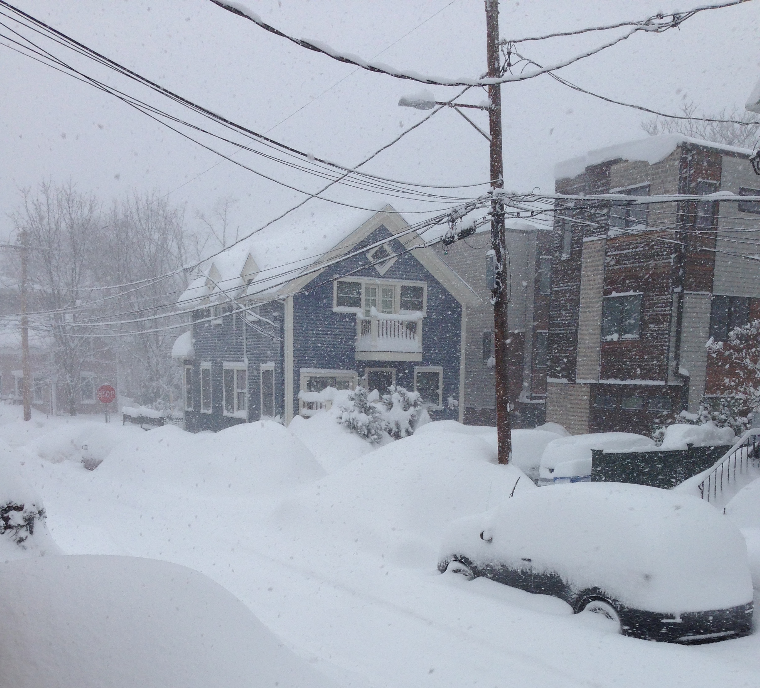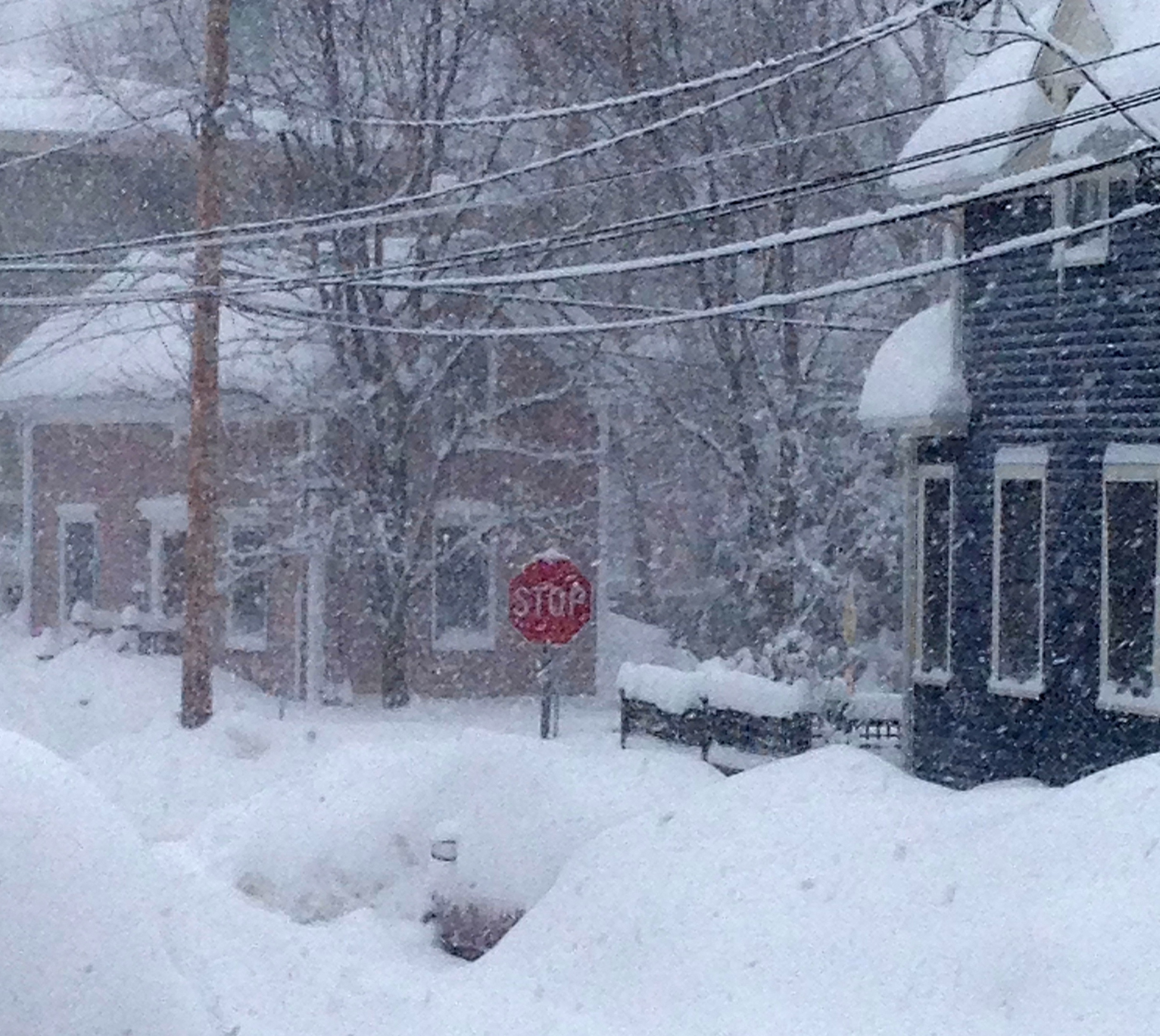 Later. It’s still snowing, harder now and bigger clumps of flakes. I struggled my way the mile to my health club, only to find my class had been cancelled. Well, I got my exercise I guess by creeping through snow-blocked intersections and narrow rutted slippery trails between five-foot high snow mounds.