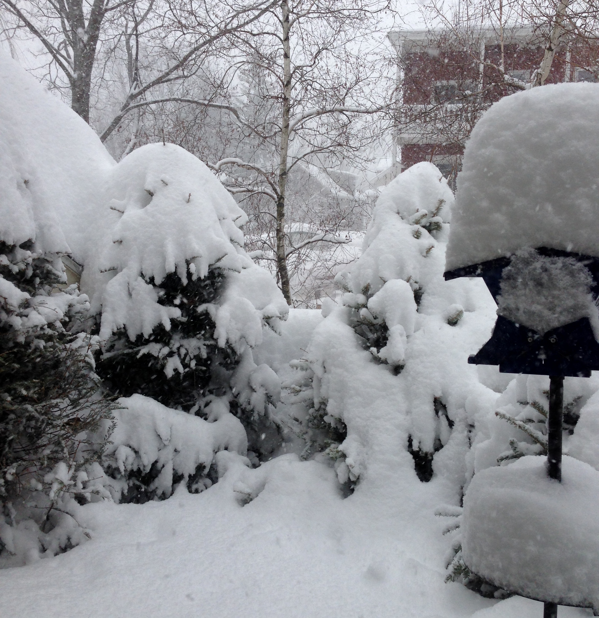On our deck there are four leftover Christmas trees, thick with snow; I always make a little pretend forest out there after the holiday trees are put out in the neighborhood. I case the nearby streets and together we haul the best ones home and up the stairs and onto the deck. We love the little forest and so do the birds, and the squirrels. I have a feeder out there, and heated water, and a hanger with suet. Right now though the suet has long since bit the dust, or snow I should say, as the constant avalanching of snow from the roof above repeatedly knocked it off its hanger and finally buried it. The squirrels will find it when there is a little melting.