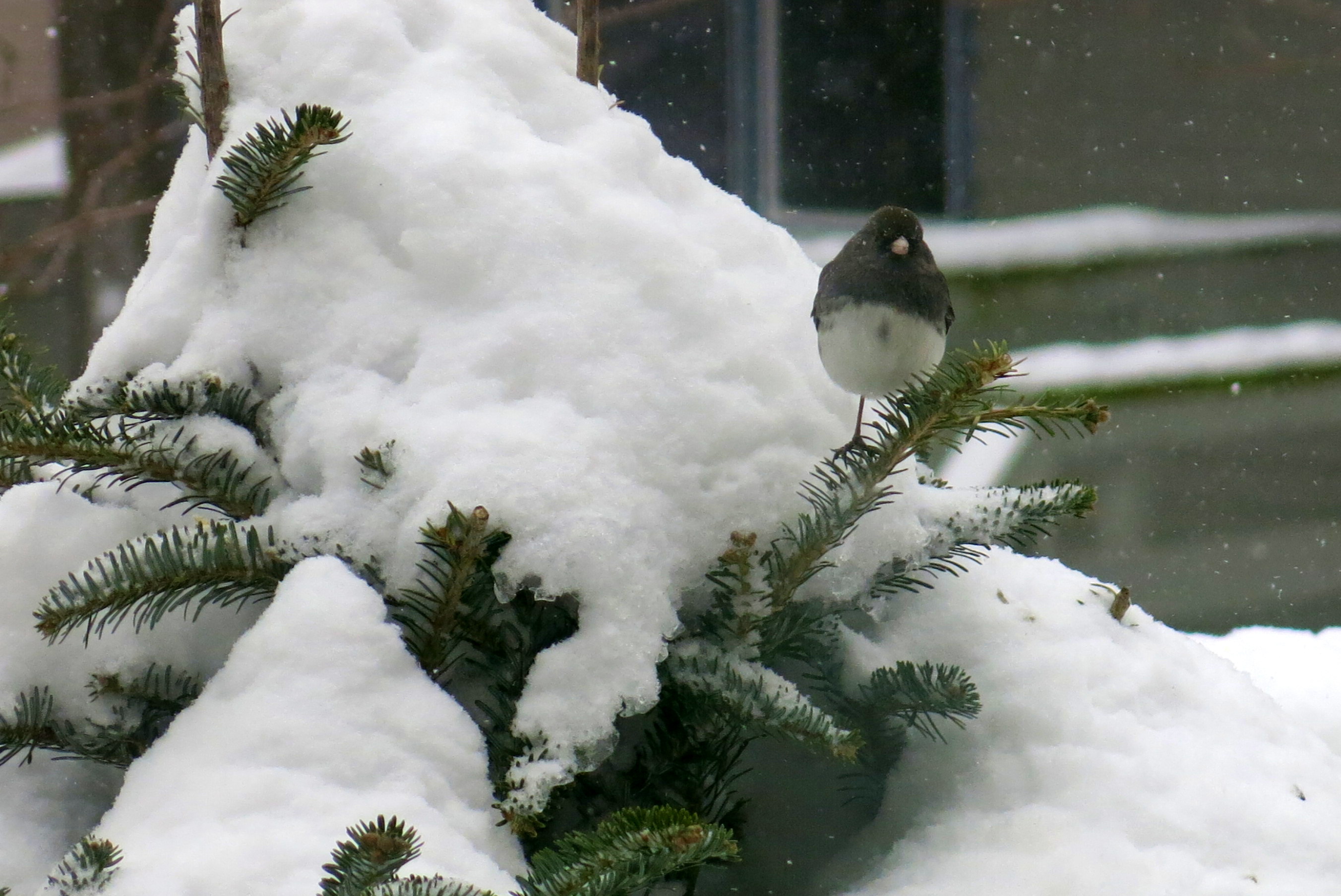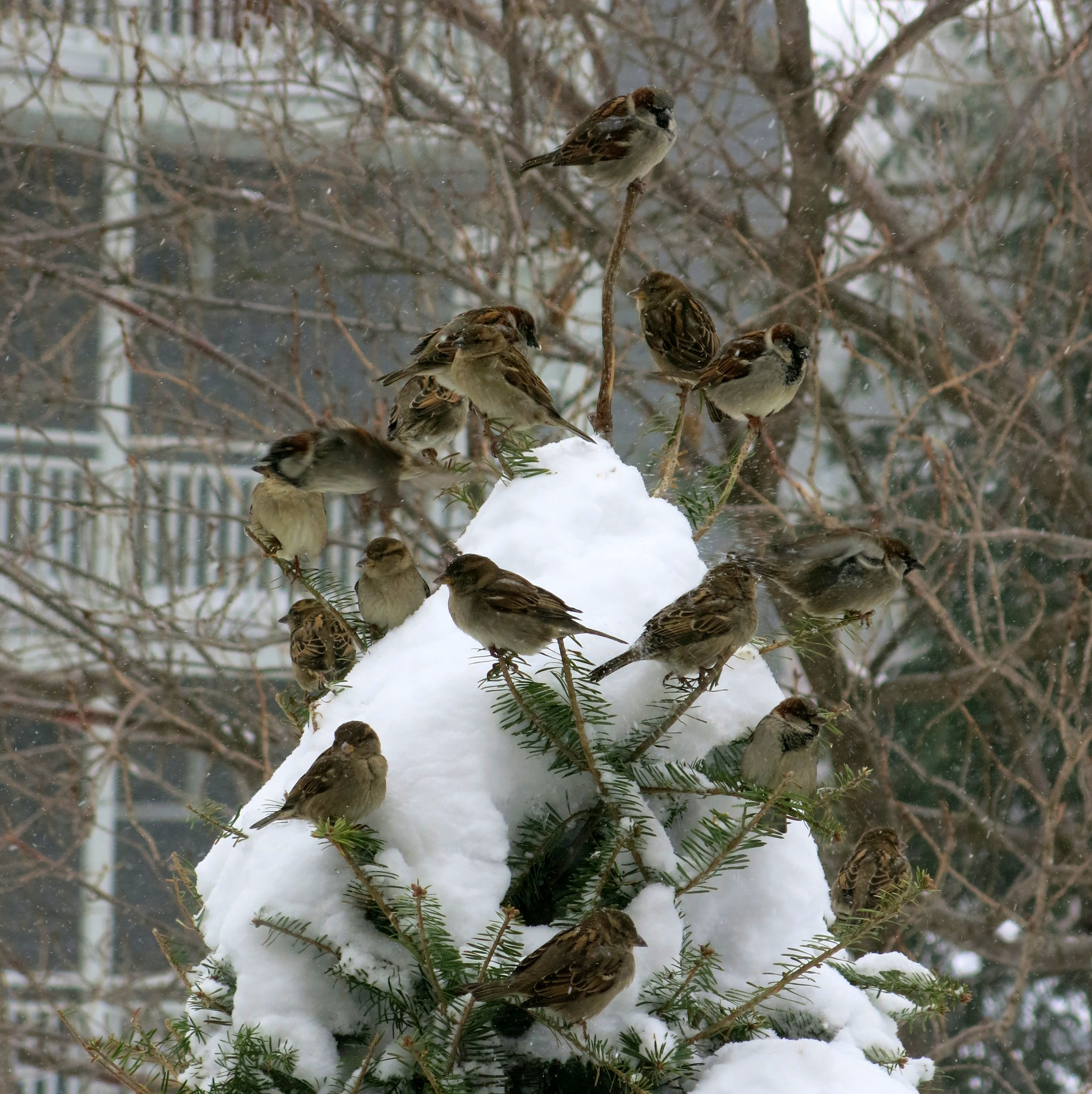 I didn’t sleep well that night, waiting for the sound of snow, or the exciting lack of sound that a big snowfall makes, muffling everything. In the morning, yes, there it was, the snow, falling, falling all day and on into the night. The birds at my bird feeders on the deck, a hundred of them, house sparrows and juncos and a robin and some mourning doves—they came eagerly to the heated water and seed and corn I put out for them. We are all in this together, this blizzard.