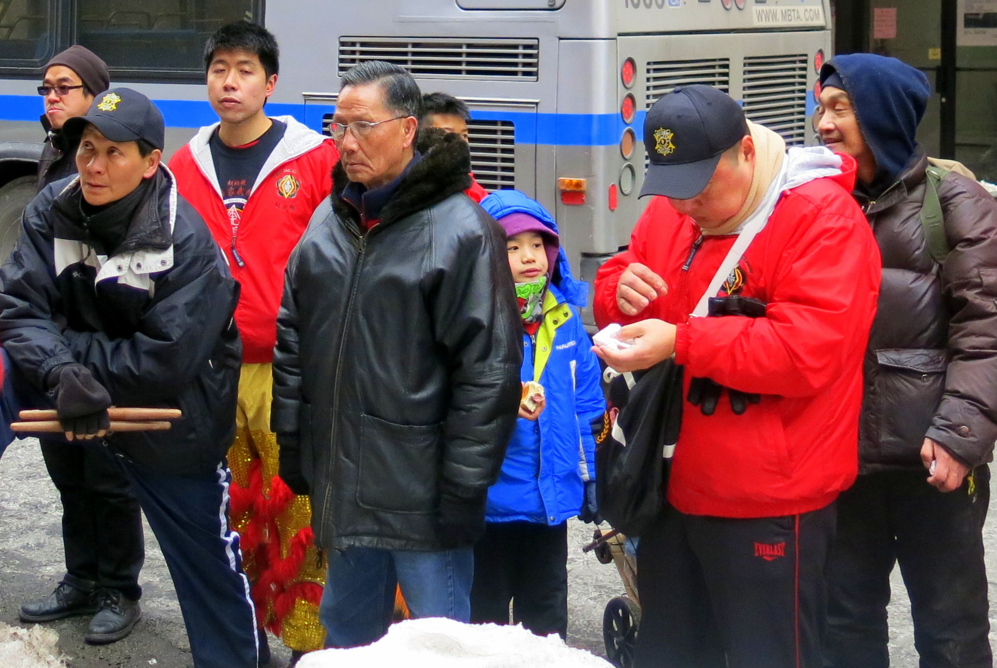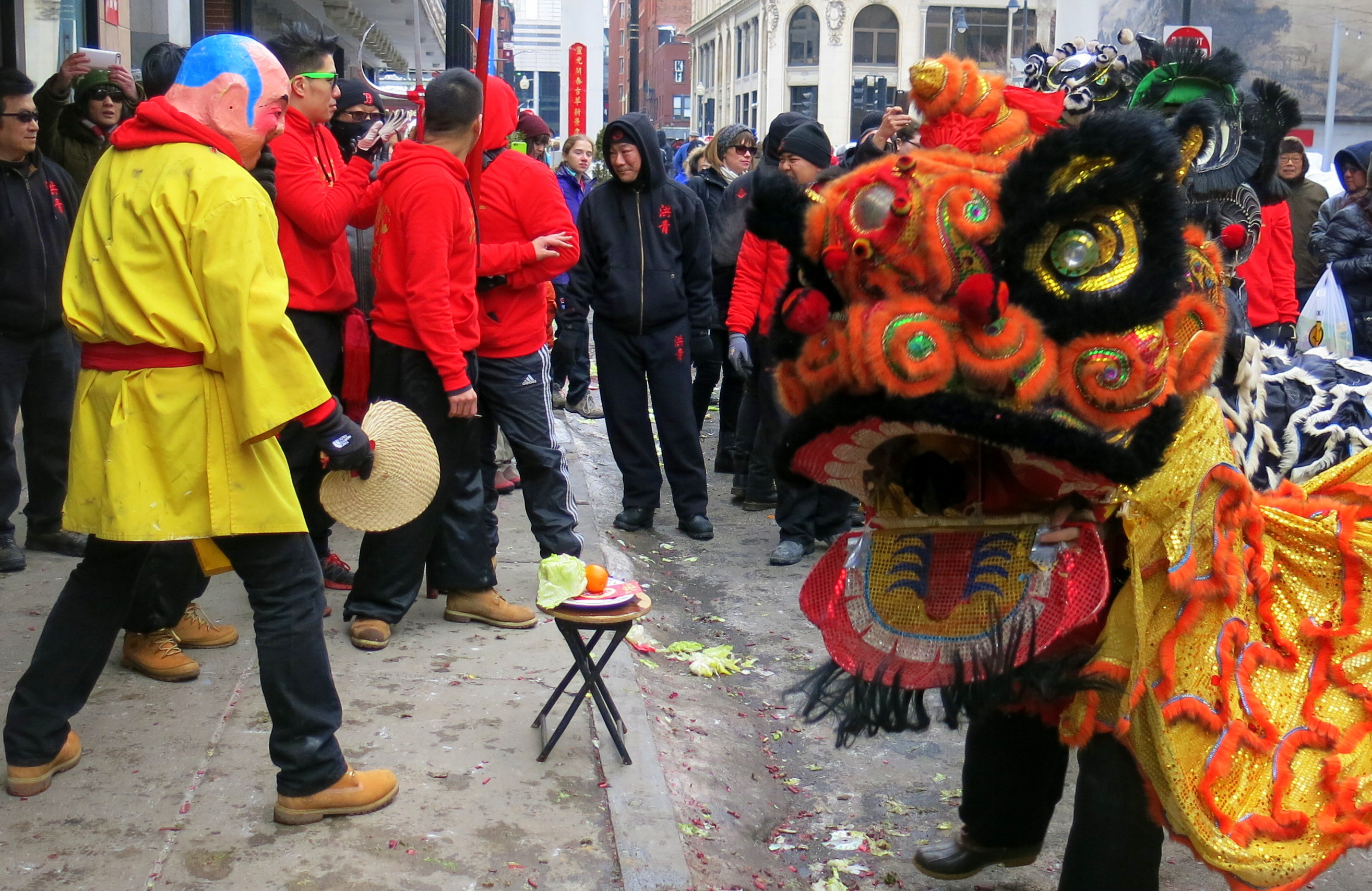 Here in Boston each lion is animated and accompanied by students from various martial arts schools. The complex and unwieldy costumes, all of which are made in small specialty shops in a few places in China, must be imported from there and can cost close to $1000 (more if you order paws and special pants). The red envelops, containing donations from the businesses visited by each lion, go to support these schools and other Chinatown enterprises.