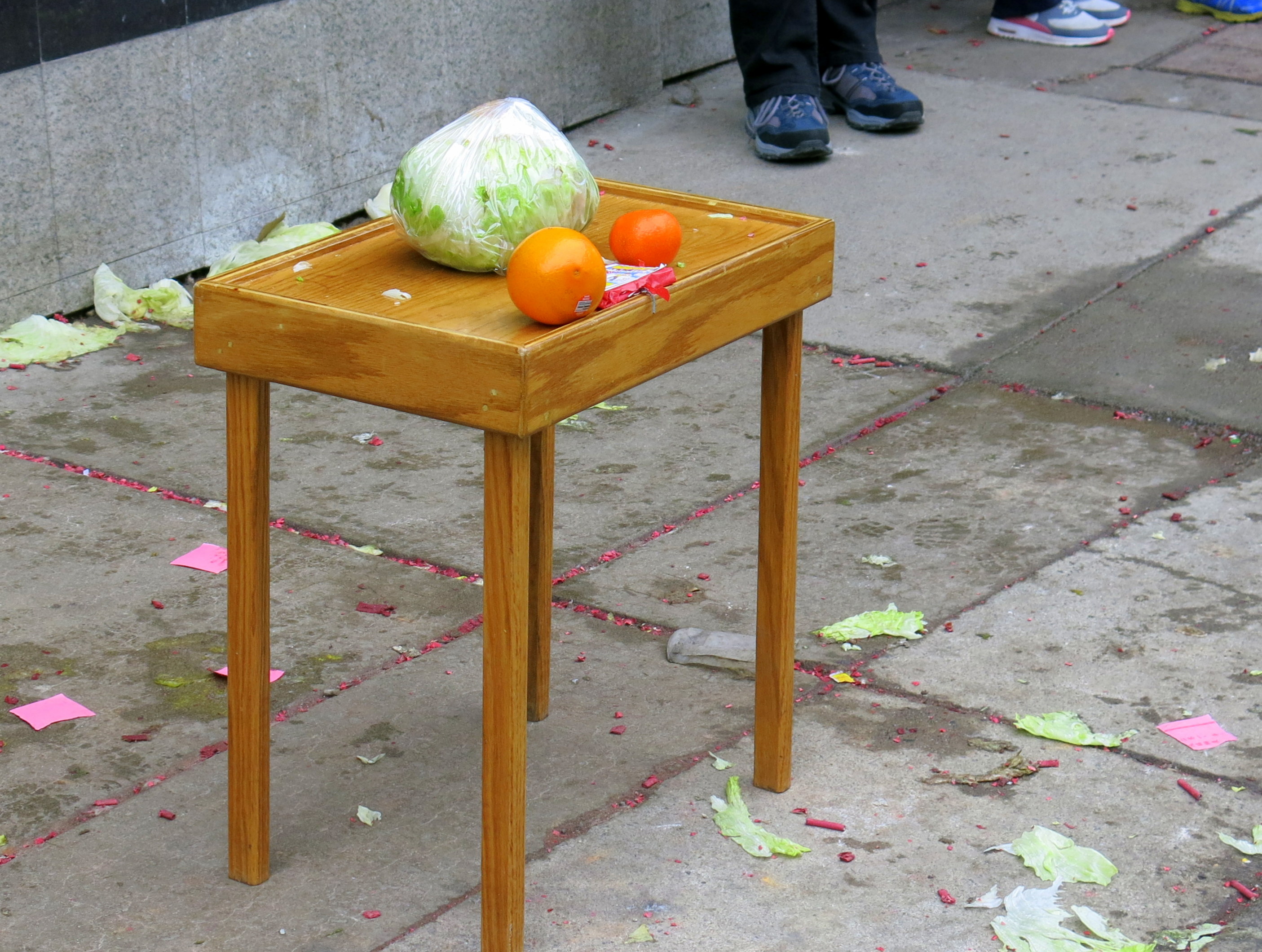 What a handsome lion! His gigantic head, with its bulging fierce eyes and wide mouth, was just now bending toward the offering of lettuce and orange, on the stool at the entrance to the bakery. With a flourish he inspected the food, then appeared to snatch it up with his big tongue. A few seconds later the orange was flung into the air, to be caught by some lucky bystander, and the lettuce, now seemingly shredded by his sharp teeth, was strewn on the ground, at least what was left after he chewed it up. A red envelop was there too, but I didn’t see what became of it.