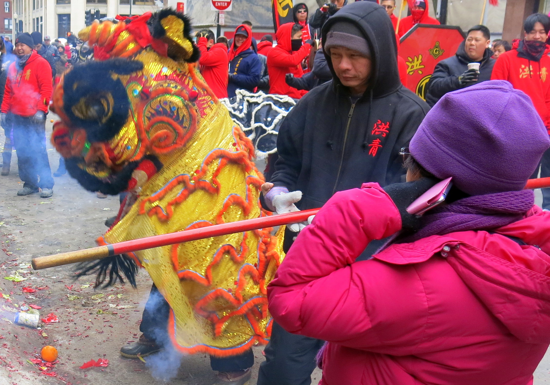 By this time I discovered that there were some other lions and attendants in the next street, these a pair, one white and one black. I switched my allegiance and went to watch them. Amidst the noise and general mild and cheerful mayhem I could see that they were doing much the same as Red-and-Gold Lion, moving from business to business, dancing and cavorting at the urging of a Buddha, and consuming delicious and auspicious meals of lettuce and orange, leaving sidewalks strewn with slippery half-”eaten” lettuce leaves and red firecracker papers. In fact, lions were everywhere in the streets of Chinatown this cold afternoon!